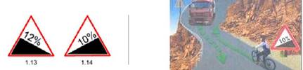 На уклонах, обозначенными предупреждающими знаками 1.13 «Крутой спуск» и 1.14 «Крутой подъем», при наличии препятствия уступить дорогу должен водитель транспортного средства, движущегося на спуск.