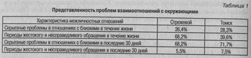В последний месяц перед обращением за специализированной помощью о проблемах в отношениях с близкими заявило сравнимое количество (68,2%) пациентов г. Стрежевого и 71,7% г. Томска, что несомненно свидетельствует о том, что одной из главных причин обращения за помощью является давление со стороны ближайшего окружения больного. Вместе с тем жестокое и несправедливое