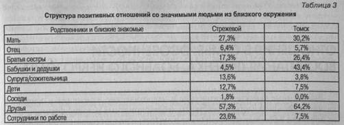 Ранжирование значимости отношений по степени убывания показывает, что наиболее значимыми являются отношения с друзьями, следующими стоят отношения с матерью и братьями и сестрами. Для Стрежевого имеют значение отношения с коллегами по работе, супругами и детьми; для Томска — с бабушками и дедушками. Отношения с остальными представителями окружения достоверных различий не имели.