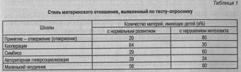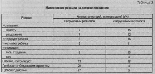 Наиболее типичными реакциями матерей на поведение умственно отсталого ребенка является стремление опекать его, жалея, следить за ним, помогать ему, но вместе с тем проявляется и раздражение, желание наказать, проигнорировать. Нередко родители испытывают горе и страдание. Среди полученных ответов были такие: «Мне жаль ребенка, ведь он же больной»; «Кто его еще пожалеет, как не мать»; «Очень волнуюсь за ребенка»; «Отругаю его, даже побью»; «Не обращаю внимания на ребенка».