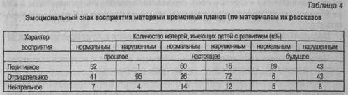 Анализ материнских рассказов показал, что восприятие временных планов (прошлое, настоящее, будущее) имеет разный эмоциональный знак. Полученные данные представлены в табл. 4.