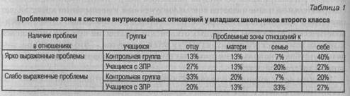 По степени выраженности проблем в системе внутрисемейных отношений среди нормально развивающихся учащихся и детей с ЗПР выделено две подгруппы. Первую подгруппу составили дети с ярко выраженными проблемами в сфере внутрисемейных отношений. В ответах этих учащихся звучало четко выраженное негативное отношение к отцу или матери. Среди школьников с ЗПР их оказалось 40% (табл. 1). Под слабо выраженными проблемами (вторая подгруппа учащихся) подразумевается та категория ответов детей, в которых не проявилась отчетливо негативная позиция ребенка в отношении к родителям. Данную группу составили 33% младших школьников с ЗПР.