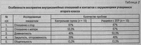 В нашем исследовании изучались особенности взаимоотношений в семьях, где воспитываются дети с ЗПР младшего школьного возраста. Была предпринята попытка выявить соотношение между проблемами семейного воспитания и некоторыми аспектами формирования личности ребенка. В эксперименте участвовали учащиеся второго класса: 15 школьников с ЗПР, обучающихся в классе выравнивания общеобразовательной школы и 15 учащихся с нормальным психическим развитием. Учащиеся второго класса были выбраны для данного обследования не случайно. На наш взгляд, это позволяет исключить проблемы, связанные с периодом школьной адаптации, который, как известно, у большинства детей с ЗПР иногда растягивается во времени до конца первого класса.
