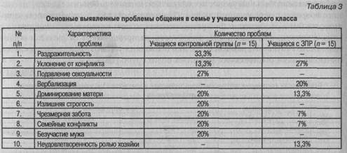 Общая характеристика состава семей у детей с нормальным психическим развитием и с ЗПР позволила выявить их значительные отличия. У школьников с ЗПР 20% семей были неполными (без отца). В 27% случаев среди семей учащихся с ЗПР и у 7% семей, где воспитывались нормально развивающиеся дети, встречались родители-алкоголики. Анкетирование родителей позволило установить, что