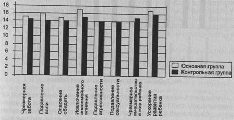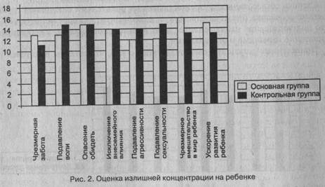Группа признаков, относящаяся к излишней концентрации на ребенке (рис. 2): чрезмерная забота, подавление воли, опасение обидеть, исключение внесемей-ных влияний, подавление агрессивности, подавление сексуальности, чрезвычайное вмешательство в мир ребенка, ускорение развития ребенка, — имеют различия в признаках чрезмерной заботы, вмешательства в мир ребенка и его ускоренное развитие, с преобладанием их значений в основной группе. Чрезмерная забота родителей основной группы легко объясняется тем, что больной ребенок требует больше внимания, он более зависим от родителей. Выраженность этого признака в свою очередь, приводит к тому, что родители стремятся все знать о ребенке, стараются ограждать его от жизненных сложностей и забот.