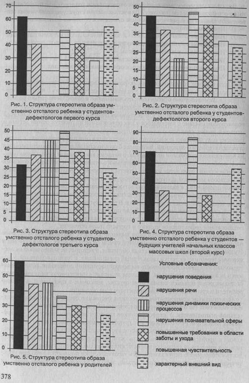 Центральным компонентом стереотипа умственно отсталого ребенка у будущих педагогов (за исключением первокурсников) является нарушение познавательной деятельности. У первокурсников главный элемент стереотипа — нарушения поведения (что сближает их с группой родителей) (рис. 1 и 5).