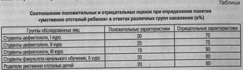 Социальный стереотип образа умственно отсталого ребенка у людей, мало знакомых с проблемой умственной отсталости, не содержит таких категорий описаний, как нарушения динамики психических процессов и повышенная чувствительность к отношению окружающих. Эти характеристики познаются либо при практическом взаимодействии с этими детьми, либо в процессе их обучения. Родители