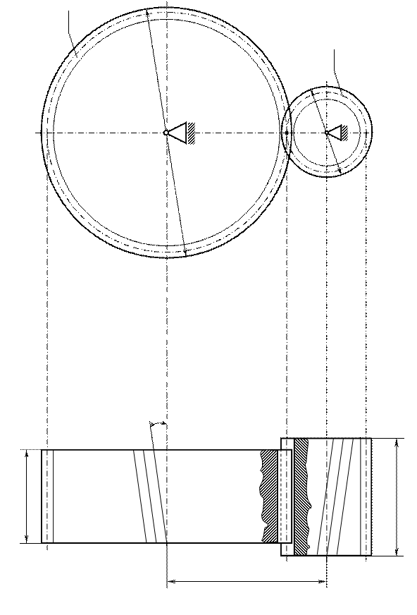Примечание. Чертеж схемы зубчатой передачи должен иметь два вида передачи: сверху и сбоку. На чертеже должны быть проставлены габаритные размеры передачи, межосевое расстояние, числа и нормальный модуль зубьев колес, значение и направление угла наклона зубьев колес, направление и значение скорости вращения шестерни (см. рис. 6).