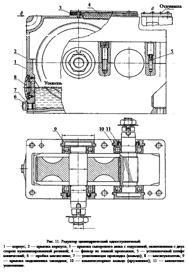 Чертеж схемы подшипникового узла ведомого вала зубчатой передачи вычерчивается в соответствии с рис. 9. Общий вид редуктора представлен на рис. 11. На чертеже указать наименование деталей, входящих в конструкцию подшипникового узла ведомого вала зубчатой передачи. К стандартным деталям относятся: подшипник, компенсаторное кольцо, гайка, шайба, манжета, шпонка.