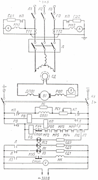 Напряжение 6000 В подаётся на верхние губки разъединителя Р высоковольтного распределительного шкафа. При включении разъединителя Р получает питание, через предохранители, силовой трансформатор на 6000/400 В, при этом вольтметр и лампа JI3 окажутся под напряжением. Реле напряжения РН вакуумного выключателя осуществляет нулевую защиту синхронного двигателя, действующего на отключение вакуумного выключателя ВВ при отсутствии или при снижении напряжения ниже 65% от номинального. Вольтметр и зелёная сигнальная лампа дают возможность судить о наличии и величине напряжения высоковольтной сети. При включении автомата АУ реле времени РВ разомкнёт свой контакт в цепи катушки контактора КП, нормально открытые контакты которого во время пуска синхронного двигателя остаются разомкнутыми. Обмотка ротора двигателя не обтекается постоянным током, так как обмотка возбуждения возбудителя В1 отключена от сети питания. Обмотка ротора синхронного двигателя подключена наглухо на якорь возбудителя. При включении вакуумного выключателя ВВ синхронный двигатель будет разгонятся как асинхронный. При этом нормально замкнутые блок-контакты вакуумного выключателя ВВ разомкнутся и зелёная лампа погаснет, а нормально открытые блок-контакты замкнутся и загорится красная лампа Ж.