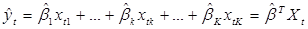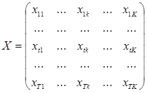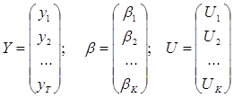 Чтобы статистически оценить параметры регрессионной модели, необходимы ряды данных длиной Т для регрессандов (Y) и для каждого из К регрессоров (переменных Х). При этом длина рядов наблюдений должна быть больше количества регрессоров (T>K). Длина временных рядов образует опорный (базовый) период. Для наблюдаемых в моменты времени t=1, 2, …, T значений можно записать Т уравнений регрессии: