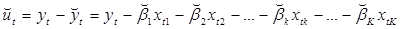 б) Метод оценки регрессионных коэффициентов , в котором применяется сумма квадратов ошибок как мера качества адаптации эмпирической функции к наблюдаемым данным, называется одношаговым методом наименьших квадратов (1-МНК). Ошибка уравнения для t-го наблюдения равна: