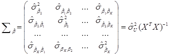 Для t – тестирования гипотез по отдельным коэффициентам регрессии и их линейным комбинациям необходимо знать элементы ковариационной матрицы. Ковариационная матрица для , оцененная методом 1-МНК, может быть представлена следующим образом: