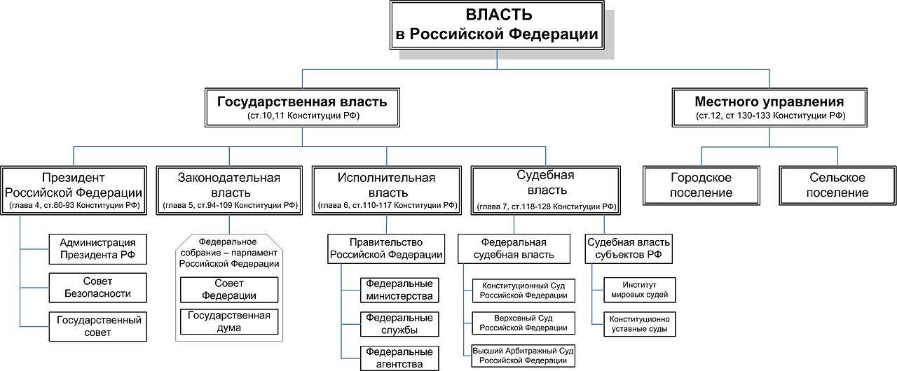 Согласно статье 11 Конституции РФ государственную власть осуществляют Президент РФ, Федеральное Собрание (Совет Федерации иГосударственная Дума), Правительство Российской Федерации, суды Российской Федерации.