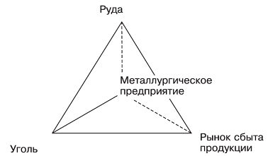 Главный фактором размещения - транспортные издержки. Точка оптимального размещения предприятия находится в зависимости от весовых соотношений перевозимых грузов и расстояний. Для решения этой задачи В. Лаунхардт разработал метод весового (или локационного) треугольника.