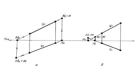 - недостающая фронтальная проекция N2 совпадает с фронтальным следом N, то есть N ≡ N2