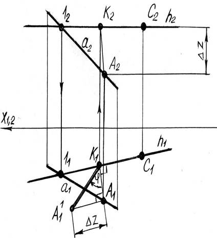 При решении метрических задач связанных с определением истинных размеров изображенных на эпюре (комплексном чертеже) фигур, могут встретиться значительные трудности, если заданные проекции не подвергнуть специальным преобразованиям. Для этой цели обычно применяют один из двух способов: вращения или замены плоскостей проекций. Для решения задачи по определению натуральной величины треугольника воспользуемся способом вращения его вокруг одной оси. Если задаться целью: одним поворотом расположить треугольник параллельно плоскости П1, то за ось вращения следует принимать такую в плоскости треугольника, которая еще до вращения была бы параллельна горизонтальной плоскости проекций, то есть одну из ее горизонталей (смотри рисунок 2.4).