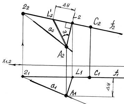 Прямые линии наибольшего наклона плоскости к плоскостям проекций П1 и П2 перпендикулярны соответственно горизонталям или фронталям этой плоскости. Рассмотрим случай определения угла наклона плоскости Σ, заданной прямой а и точкой С к горизонтальной плоскости проекций. Прямой угол, составленный линией наибольшего ската плоскости с ее горизонталью проецируется на горизонтальную плоскость проекций П1 без искажений. Для решения данной задачи (смотри рисунок 2.2):