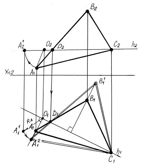 друг с другом и с неподвижной вершиной С1, получаем горизонтальную проекцию треугольника. Эта проекция определяет натуральную величину треугольника АВС;