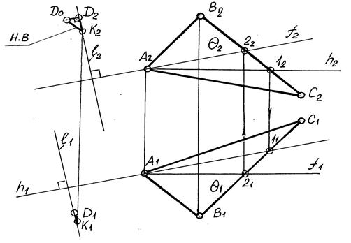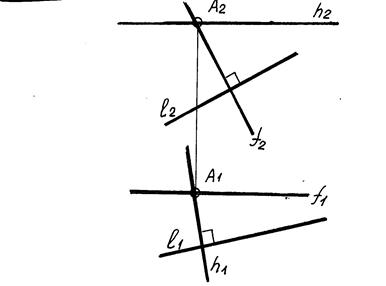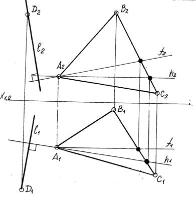 - из точки D1 восстанавливаем перпендикуляр к h1, а из точки D2 – перпендикуляр к f2 и получаем направление перпендикуляра l (l1 l2);