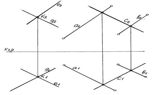 На комплексном чертеже (эпюре Монжа) (смотри рисунок 4.4) плоскость сигма задана двумя параллельными прямыми и через точку пространства К проведена плоскость, параллельная заданной, при этом прямая g параллельна с, а прямая е параллельна прямым а и в