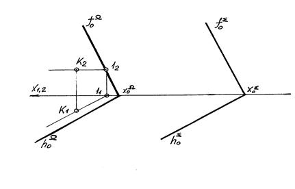 У параллельных плоскостей их главные линии (следы) соответственно параллельны. На рисунке 4.5 плоскость сигма задана следами и дана точка К, через которую нужно провести плоскость, параллельную плоскости сигма. Для этого через точку К проведем одну из главных линий плоскости (например горизонталь). Через след горизонтали будет проходить новая плоскость сигма.