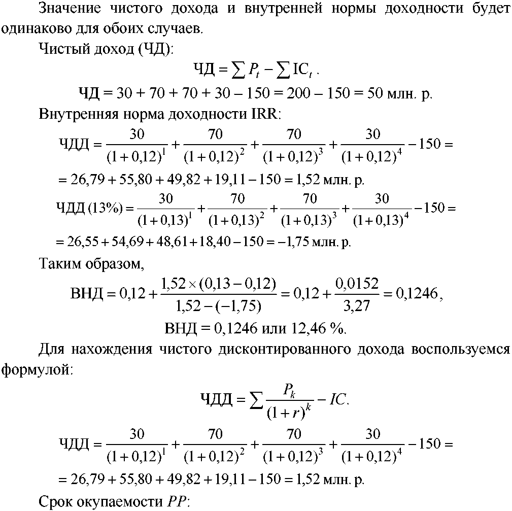 Рассчитать чистый доход, чистый дисконтированный доход, внутреннюю норму доходности, срок окупаемости для двух случаев: а) цена капитала 12 % б) ожидается, что цена капитала будет меняться по годам следующим образом: 12 %, 13 %, 14 %, 14 %.