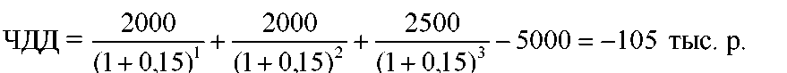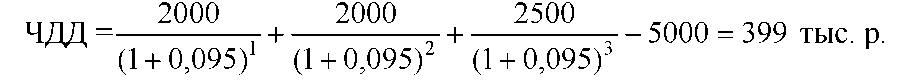 Пример. Рассматривается экономическая целесообразность реализации проекта при следующих условиях: величина инвестиций - 5 млн. р.; период реализации проекта - 3 года; доходность по годам 2000, 2000, 2500 тыс. р.; текущий коэффициент дисконтирования (без учета инфляции) - 9,5 %; среднегодовой индекс инфляции - 5 %.