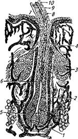 1 — сосочек; 2—влагалище; 3 — сальная железа; 4—выводной проток сальной железы; 5 —луковица волоса; 6 — корень; 7—стержень; 8-сердцевинный слой; 9— корковый слой; 10—чешуйчатый слой