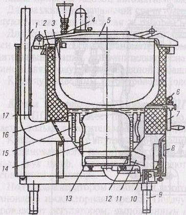 1 - дымоход, 2 - наружный корпус, 3 - варочный сосуд, 4 - наполнительная воронка с краном, 5 - крышка котла, 6 - кран уровня, 7 - маховик, 8 - дверца, 9 - ножка, 10 - рама, 11 - патрубок, 12 - кожух, 13 - горелка, 14 - топка, 15 - газоход, 16 - парогенератор, 17 - облицовка