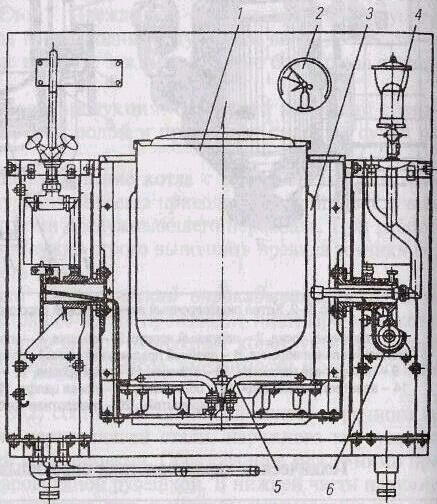 1 - варочный сосуд, 2 - манометр, 3 - пароводяная рубашка, 4 - наполнительная воронка, 5 – тены, 6 - механизм для опрокидывания котла.