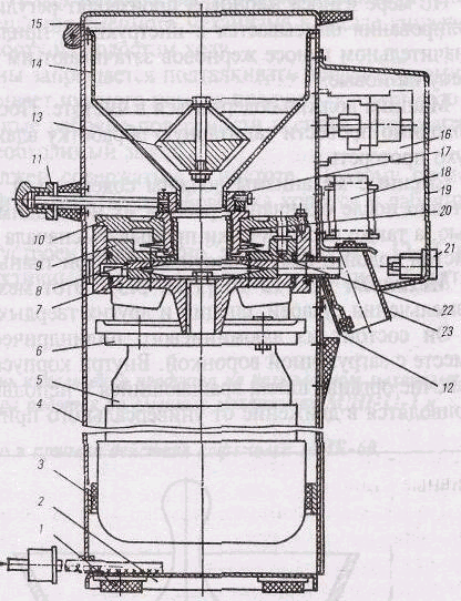 1 - резиновая опора, 2 - основание машины; 3 - амортизатор; 4 - корпус; 5 - электродвигатель; 6 - рабочая камера; 7 - подвижной диск; 8 - неподвижной жернов; 9 - фланец; 10 - съемная крышка; 11 - рукоятка; 12 - прижимная планка; 13 - магнит; 14 - загрузочный бункер; 15 - откидная крышка; 16 - магнитный пускатель; 17 - кольцо; 18 - электровибратор; 19 - панель; 20 - резьбовая втулка; 22 - демпферные пружины; 23 - труба для выгрузки.