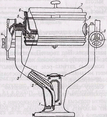 1-щиток вводной; 2-станина; 3-нагревательный элемент; 4-переключатель; 5-теплоизолшщя; 6-чаша сковороды; 7-крышка; 8-кохух; 9-маховик.