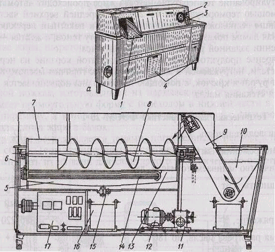 а- общий вид: 1-разгрузочный лоток; 2-электроконтактный термометр; 3-переключатели; 4-дверцы; б -разрез: 5-жарочная ванна; 6-каркас; 7-разгрузочная лопатка; 8-шнек; 9-транспортер; 10-бункер; 11-редуктор; 12-электродвигатель; 13-перфорированный лист; 14-тэны; 15-сливной кран; 16-бачок; 17-щиток с электрической аппаратурой управления.