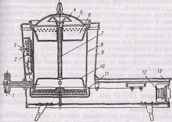 1 - кран, 2 - терморегулятор, 3 - сигнальная лампа, 4 - отражатель, 5 - крышка, 6 - фильтр, 7-циркулярная труба, 8-варочный сосуд, 9-корпус, 10-колпак, 11-тен, 12-переключатель, 13-стол.