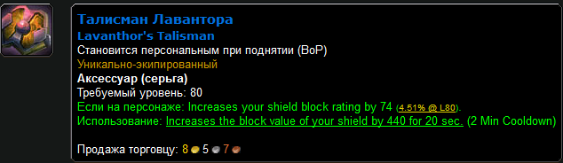 В Аметистовой крепости с Лавантора дропается Талисман Лавантора - поднимает рейтинг блокирования на 74. При использовании вы получаете 440 к блокированию на 20 секунд.
