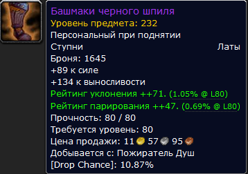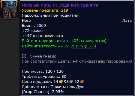 В этом инсте с треша (с простых мобов) есть шанс дропа пояса Титановая цепь знаний, а с главного босса Пожирателя Душ дропаются Башмаки черного шпиля и Ножные латы из ледяного гранита.