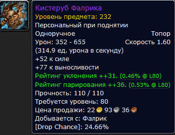 В героическом режиме есть процент дропа с босса Фалрика топора Кистеруб Фалрика.