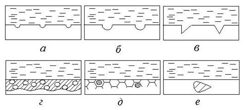 | Рис. 4. Неравномерная коррозия: пятнами (а); язвами (б); питтинговая (в); межкристаллитная (г); внутрикристаллитная (д); подповерхностная (е) |