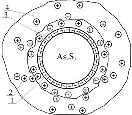 | Рис. 11. Строение мицеллы золя сульфида мышьяка (1 — ионы HS–; 2 — ионы H+; 3 — адсорбционный слой; 4 — диффузный слой) |