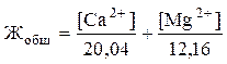 Если содержание ионов кальция и магния было найдено другими методами, общую жёсткость воды Жобщ (ммоль экв/л) можно вычислить по формуле:
