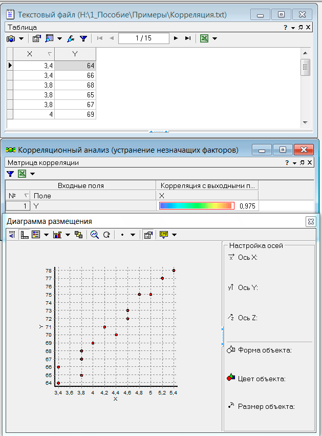применяют корреляционный анализ. На основе данных наблюдений построена матрица корреляции и диаграмма размещения (рис.6.6) с использованием возможностей аналитической платформы Deductor.