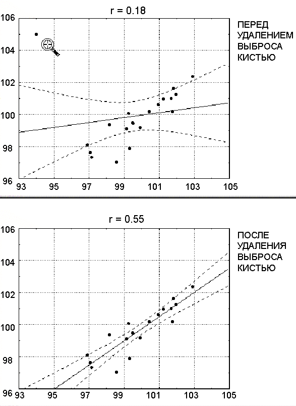 Рис. 6.7. Влияние выброса на значение коэффициента корреляции [9]
