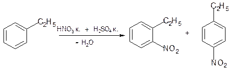 Этилбензол можно отличить от бензола по реакции окисления с раствором КМnО4. Бензол не вступает в эту реакцию, а этилбензол образует в результате окисления бензойную кислоту: