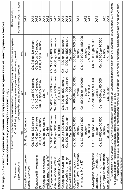 В таблицах 5.30 и 5.31 приведены, соответственно, классы среды по условиям эксплуатации для арматуры железобетонных конструкций при воздействии жидких неорганических сред, содержащих хлориды и при воздействии на конструкции из бетона и железобетона жидких неорганических сред.