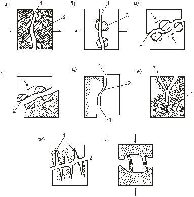 а, б – отрывной, в, г – сдвиговый, д – з – смешанные механизмы разрушения: