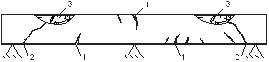 1 – нормальные трещины в зоне максимального изгибающего момента, 2 – наклонные трещины в зоне максимальной поперечной силы, 3 – трещины и раздробление бетона в сжатой зоне элемента