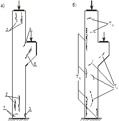 | Рисунок 6.7 – Картина трещинообразования в колоннах сплошного сечения: а – трещины от действия эксплуатационных нагрузок; б – трещины от усадки бетона (Т у), коррозии арматуры (Т к), монтажных нагрузок (Т м) |