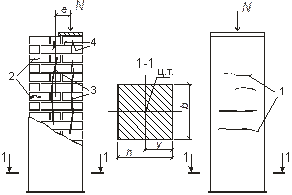 Характер трещинообразования в кирпичных колоннах зависит от величины эксцентриситета приложения силы.