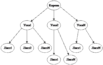 Узел – это совокупность атрибутов данных, описывающих некоторый объект. Каждый узел более низкого уровня связан только с одним узлом, более высокого уровня. Иерархическое дерево имеет только одну вершину (корень дерева), не подчиненную никакой другой вершине. Узлы, не имеющие выходных стрелок, носят название листьев. Узел интегрируется как запись. Для поиска необходимой записи нужно двигаться от корня к листьям, т.е. сверху вниз.